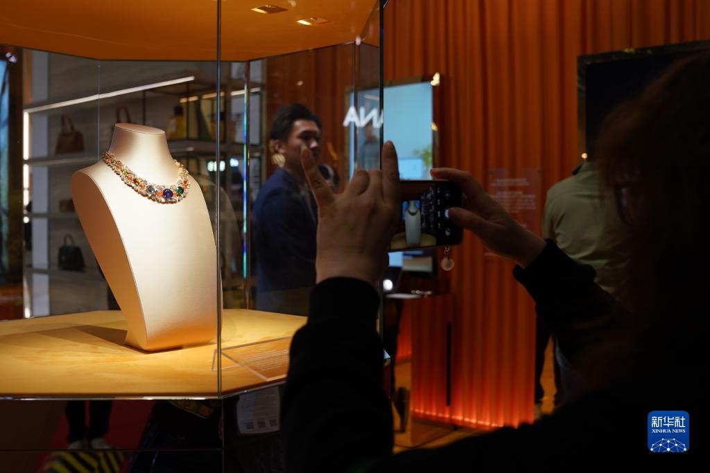 11月9日,在第六屆進博會消費品展區,參觀者在寶格麗展臺拍攝展出的珠寶。