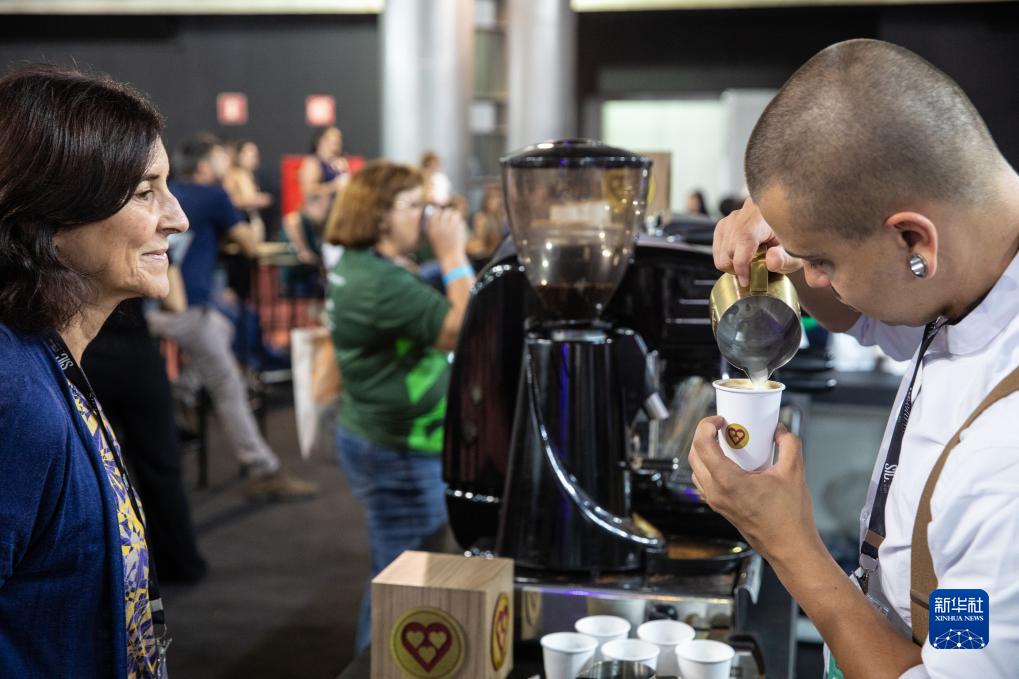 11月9日,咖啡師在巴西貝洛奧里藏特舉行的咖啡周上為參觀者制作咖啡。