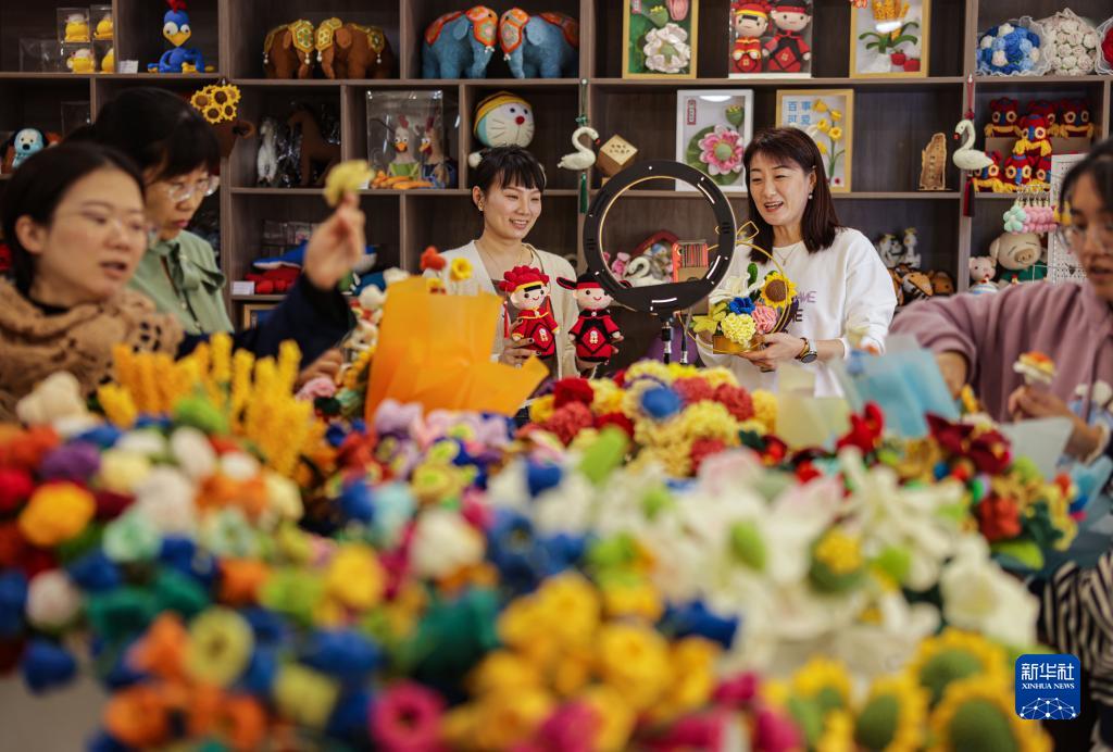 11月9日,山東省榮成市巾幗創(chuàng)業(yè)孵化基地,婦女創(chuàng)客在包裝毛線編織手辦、花束訂單。