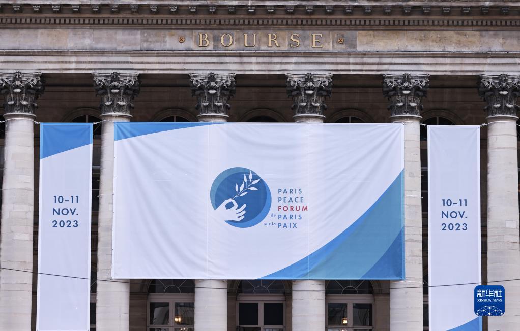 這是11月10日拍攝的巴黎和平論壇會(huì)場所在建筑物上的海報(bào)。