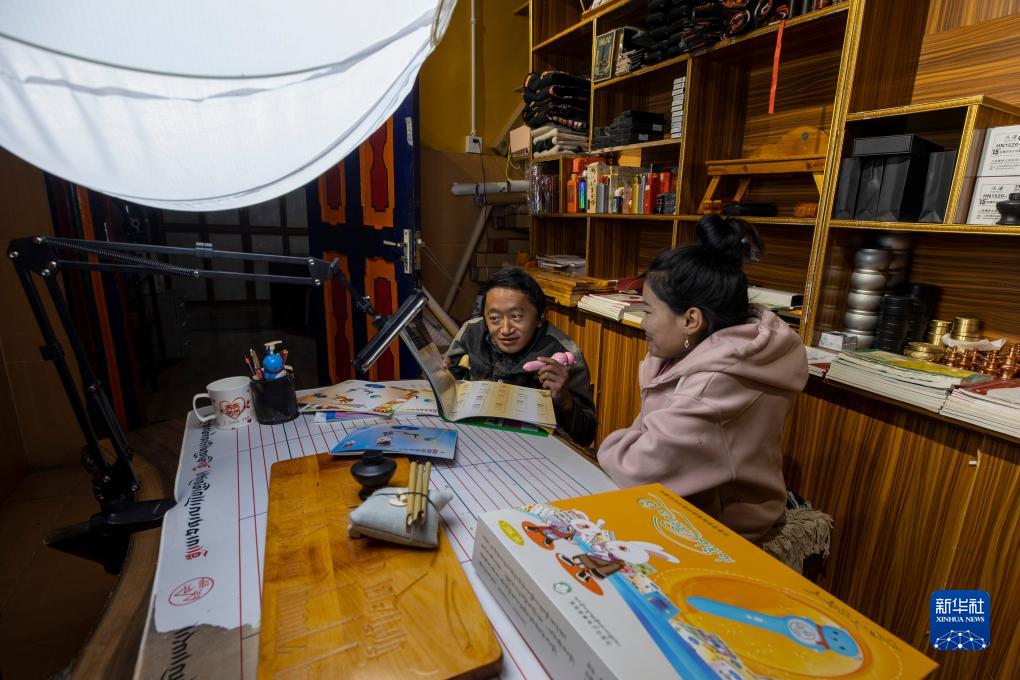 西藏拓崗文化傳播有限公司員工拉巴頓珠(左)與主播索朗德吉合作直播銷售藏語學習文具(11月10日攝)。