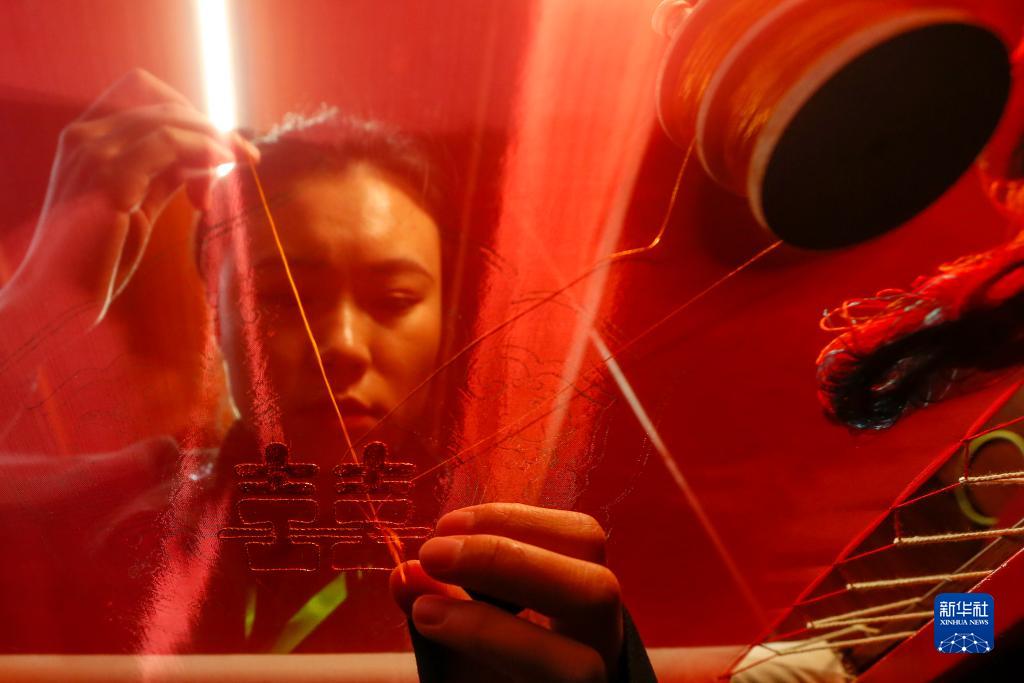11月10日,參展人陳戴苗在第六屆中國非物質文化遺產傳統技藝大展上展示“金銀彩繡”非遺傳統技藝。