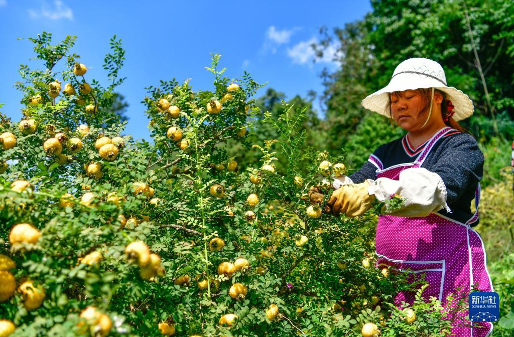 農民在貴州省龍里縣谷腳鎮茶香村采摘刺梨(9月1日攝)。