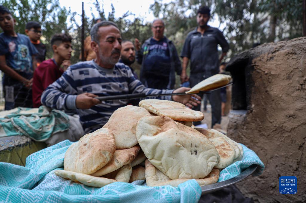 11月11日,在加沙地帶南部城市汗尤尼斯,志愿者為無家可歸的巴勒斯坦人制作大餅。