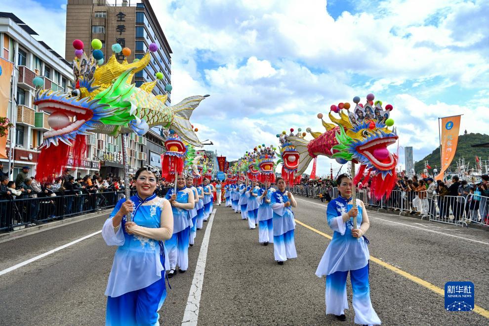 11月11日,民間藝術方陣在浙江省舟山市參加第八屆沈家門漁港民間民俗大會開幕式巡游展演。