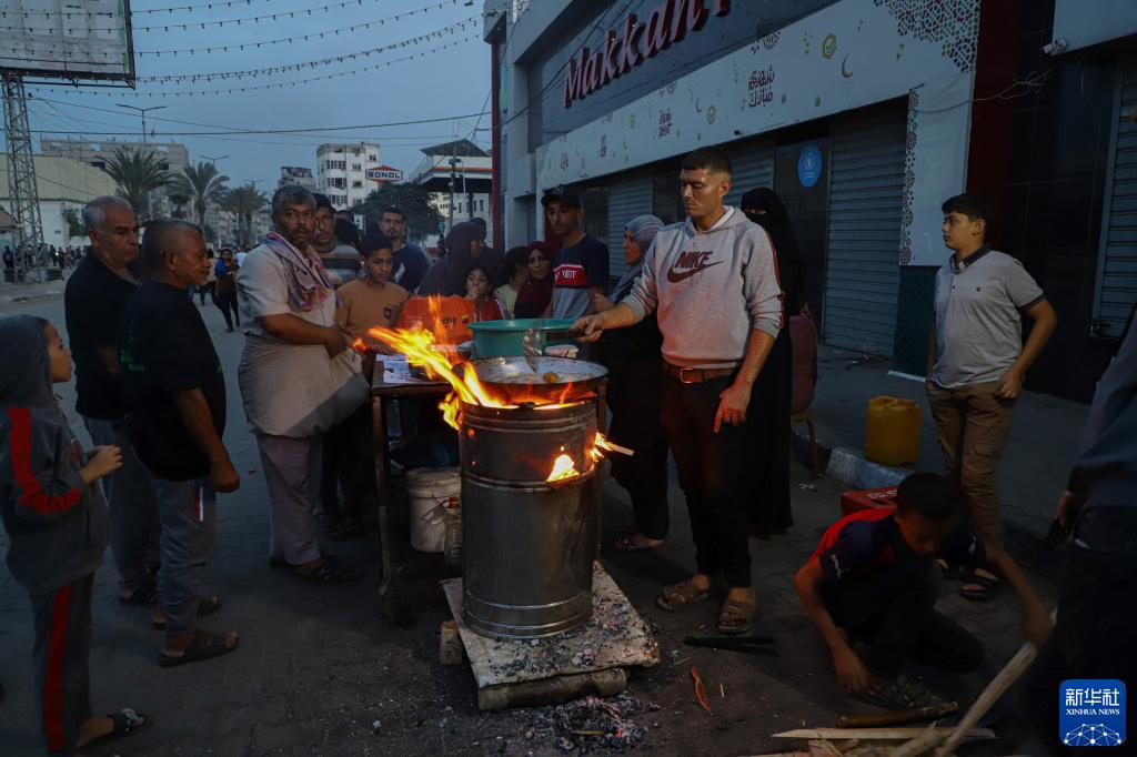 11月11日,人們在加沙地帶南部城市汗尤尼斯街頭用柴火做飯。