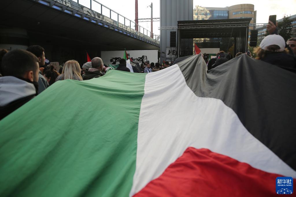 當(dāng)日,眾多巴勒斯坦支持者在比利時布魯塞爾集會,呼吁盡快實現(xiàn)加沙?;?。