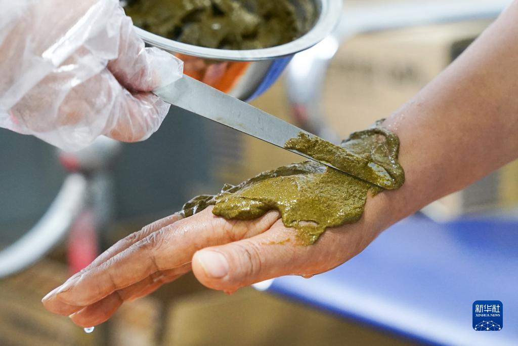 11月8日,在安徽省祁門蛇傷研究所,工作人員為蛇傷患者涂抹“祛瘀散”。