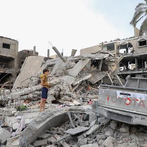 11月12日,一名兒童站在加沙地帶南部城市汗尤尼斯損毀的建筑旁。