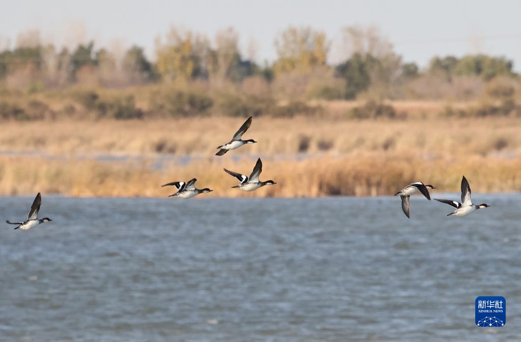 11月12日,在黃河三角洲國家級自然保護區,越冬候鳥在飛翔。
