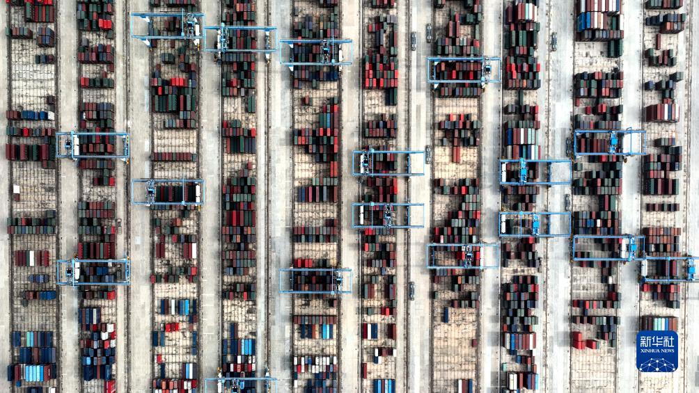 這是欽州港集裝箱自動化碼頭的集裝箱儲放地(11月12日攝,無人機照片)。