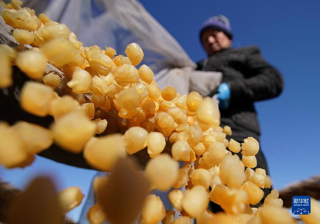11月13日,秦皇島市昌黎縣團(tuán)林鄉(xiāng)的扇貝養(yǎng)殖戶在將晾曬好的扇貝柱裝箱。