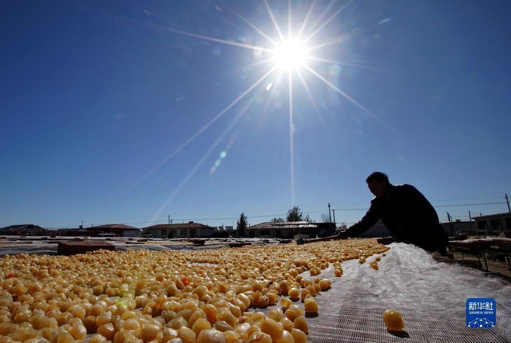 11月13日,秦皇島市昌黎縣團林鄉的扇貝養殖戶在晾曬收獲的扇貝柱。