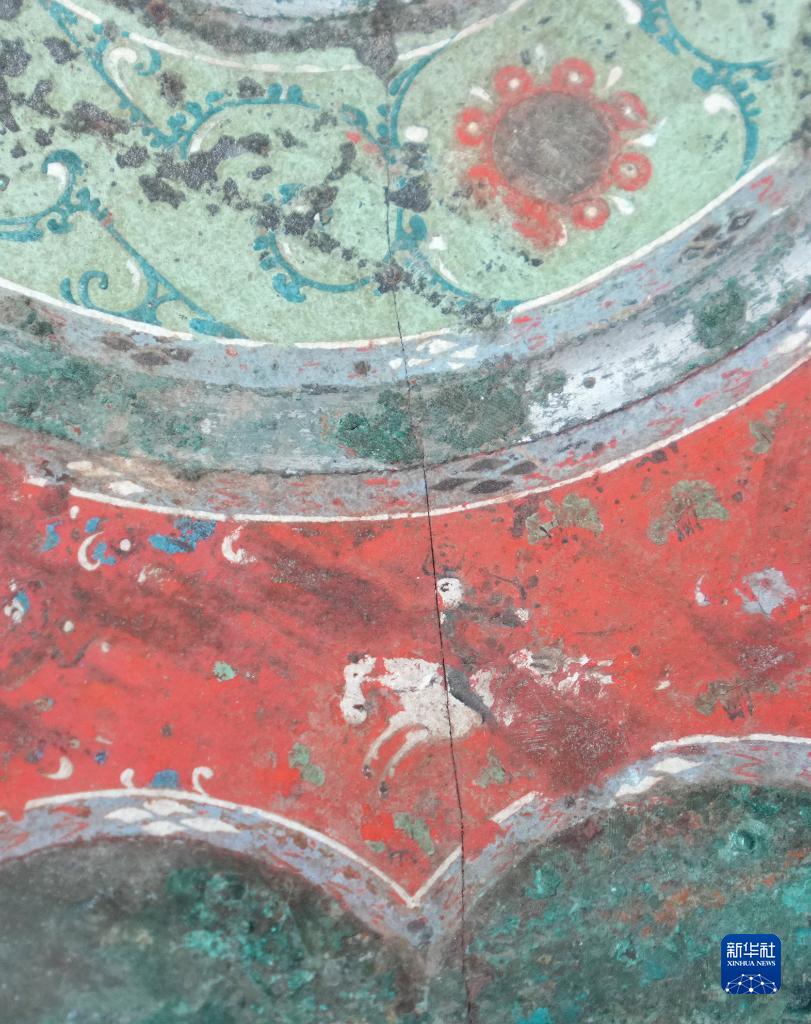 西漢彩繪人物車馬鏡局部彩繪圖案(8月25日攝)。新華社記者 王毓國 攝