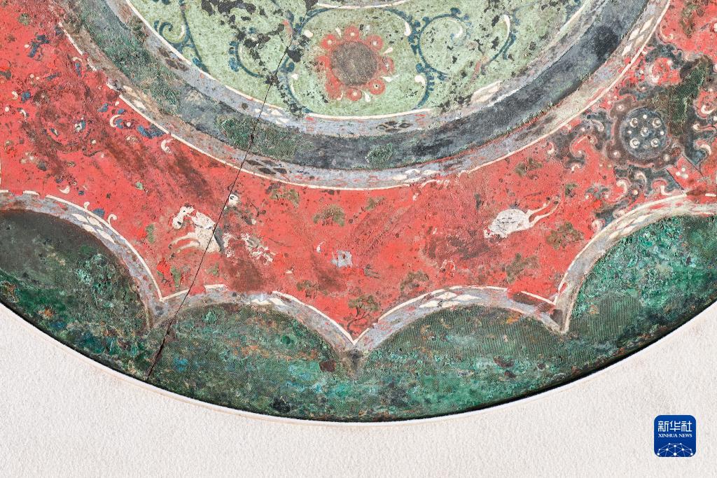 西漢彩繪人物車馬鏡局部彩繪圖案“狩獵”(8月25日攝)。新華社記者 李賀 攝