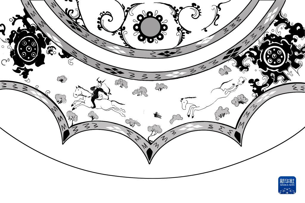 西漢彩繪人物車馬鏡局部“狩獵”圖案線稿圖。新華社發 李賀 繪制
