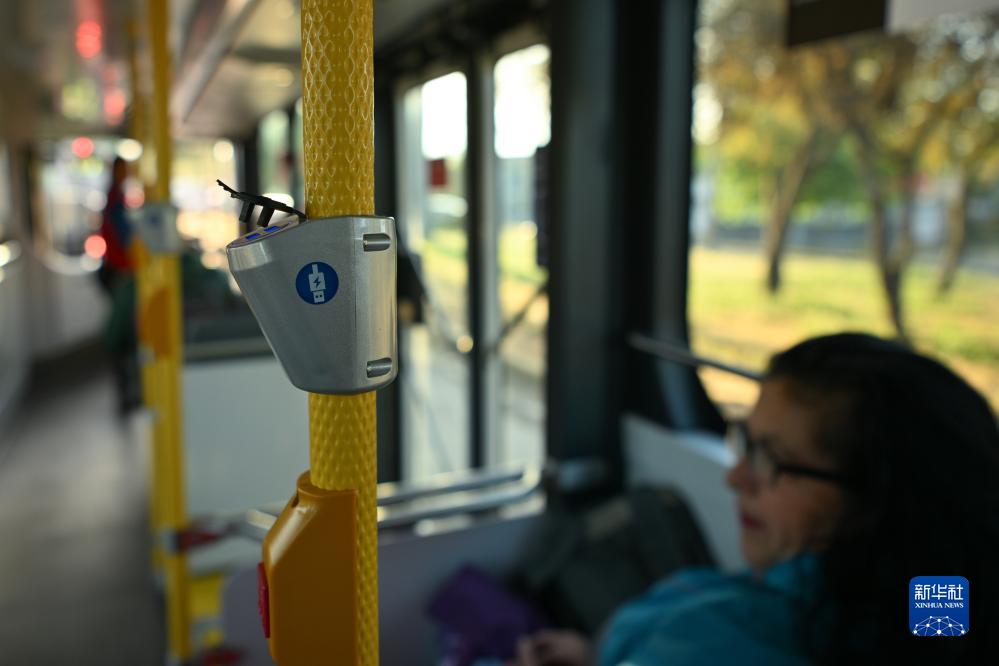 這是11月2日在智利首都圣地亞哥的一輛520路新能源公交車內拍攝的為乘客提供的USB充電接口。