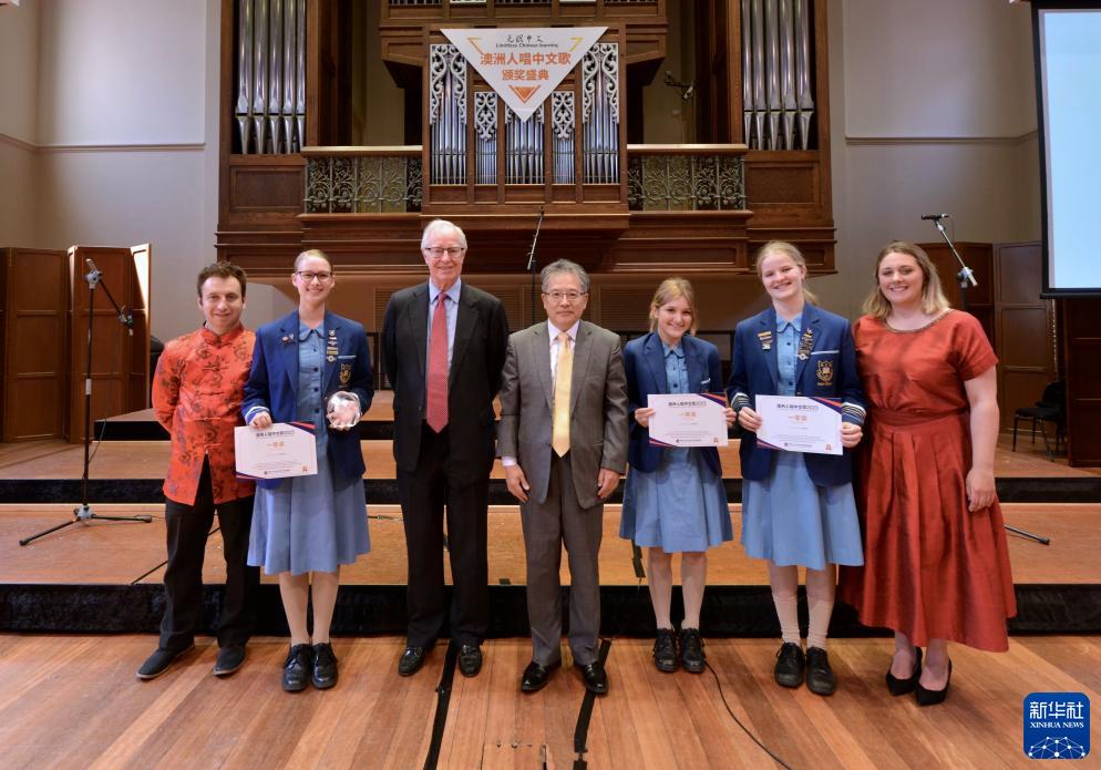 11月18日,在澳大利亞阿德萊德,中國駐阿德萊德總領事李東(中),澳中文化交流促進會榮譽會長約翰·塔普林(左三)與“澳洲人唱中文歌”比賽一等獎獲得者沃爾福德圣公會女子學校“甜蜜蜜”組合合影。