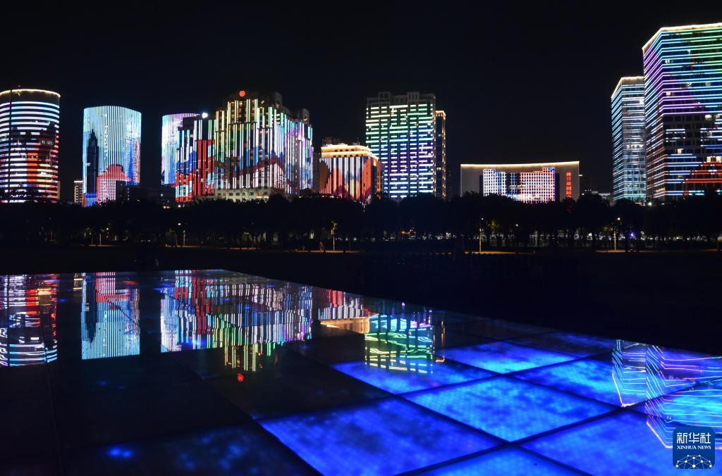 11月20日晚拍攝的廣東汕頭時代廣場世界兒童日燈光秀城市夜景。