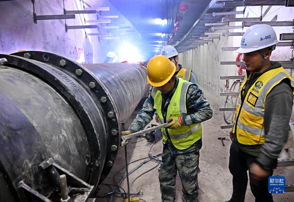 中鐵二局建設(shè)者在青島市唐河路——安順路打通工程(涉鐵段)綜合管廊內(nèi)施工(11月20日攝)。