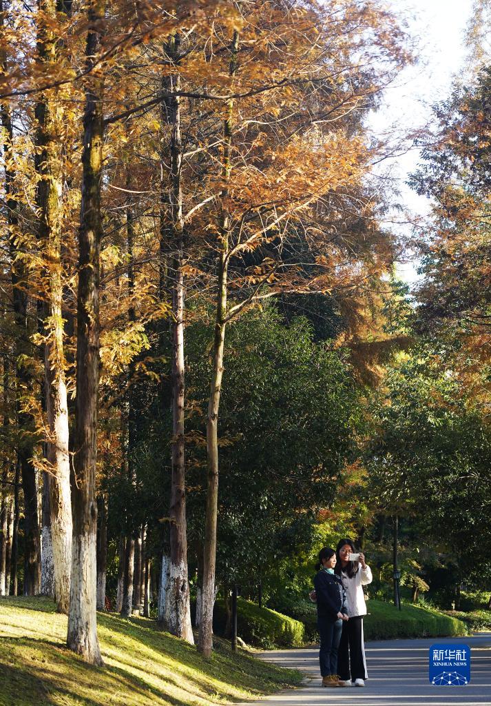 初冬時節(jié),在位于江西省南昌市的梅嶺國家森林公園,紅色的水杉、黃色的銀杏、綠色的松柏等相互交錯,構(gòu)成一幅美麗的冬日畫卷,吸引不少游客前來觀賞。