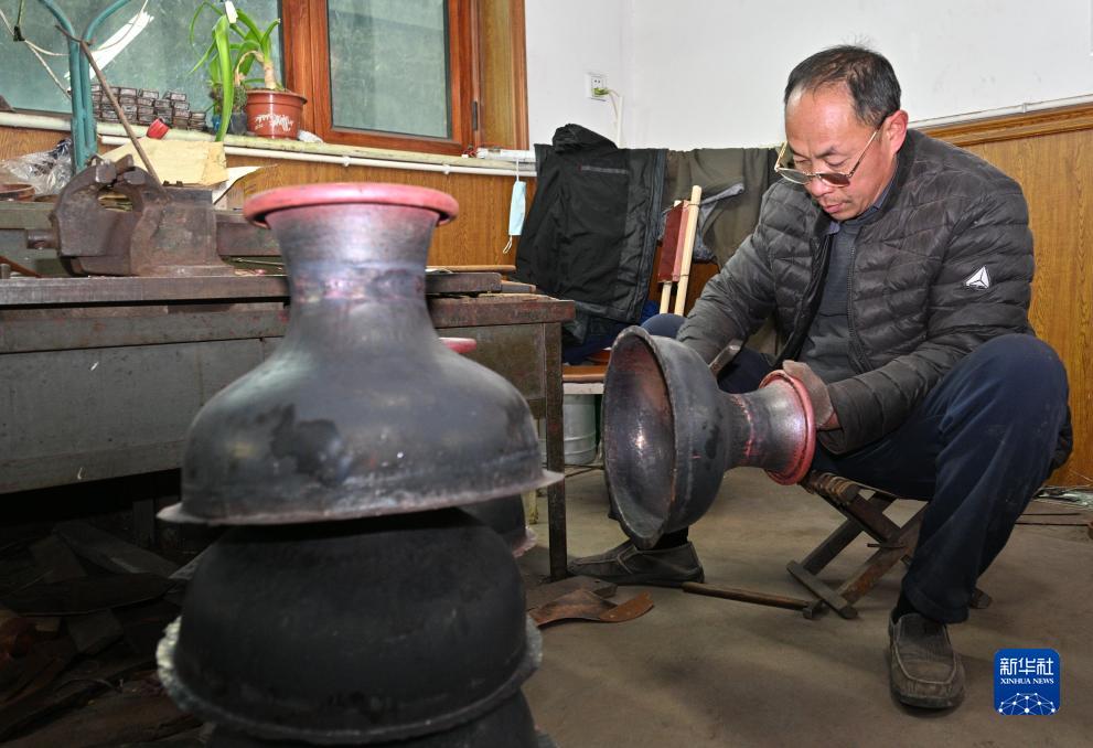 11月20日,在饒陽億澤景泰藍工藝品廠,工人為一件景泰藍制品制胎。