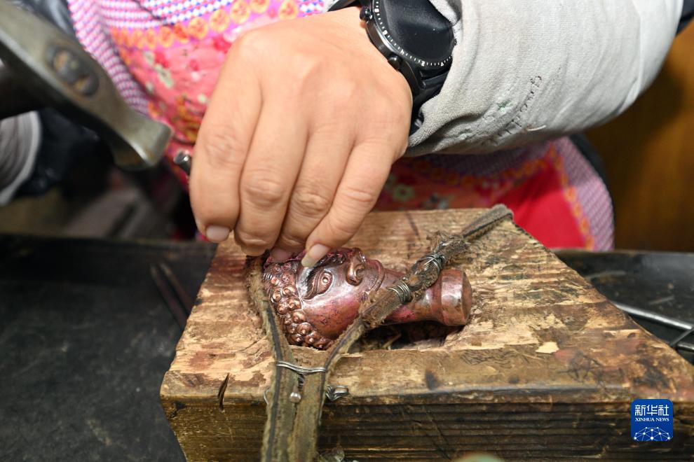 11月20日,在饒陽億澤景泰藍工藝品廠,工人在制作一件景泰藍制品的支撐腿。