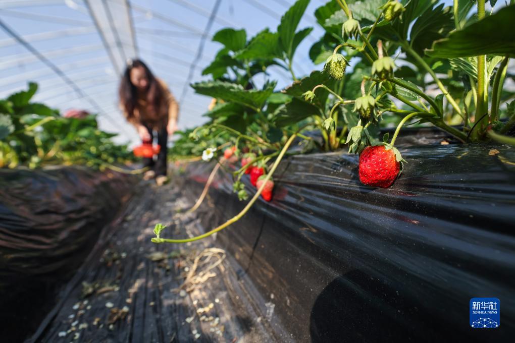 在浙江省建德市更樓街道“更有味”草莓共富合作工坊大棚內,“頭茬”早熟草莓搶鮮上市。莓農(nóng)們忙著采收新鮮草莓,通過快遞發(fā)往杭州、上海等多地市場。