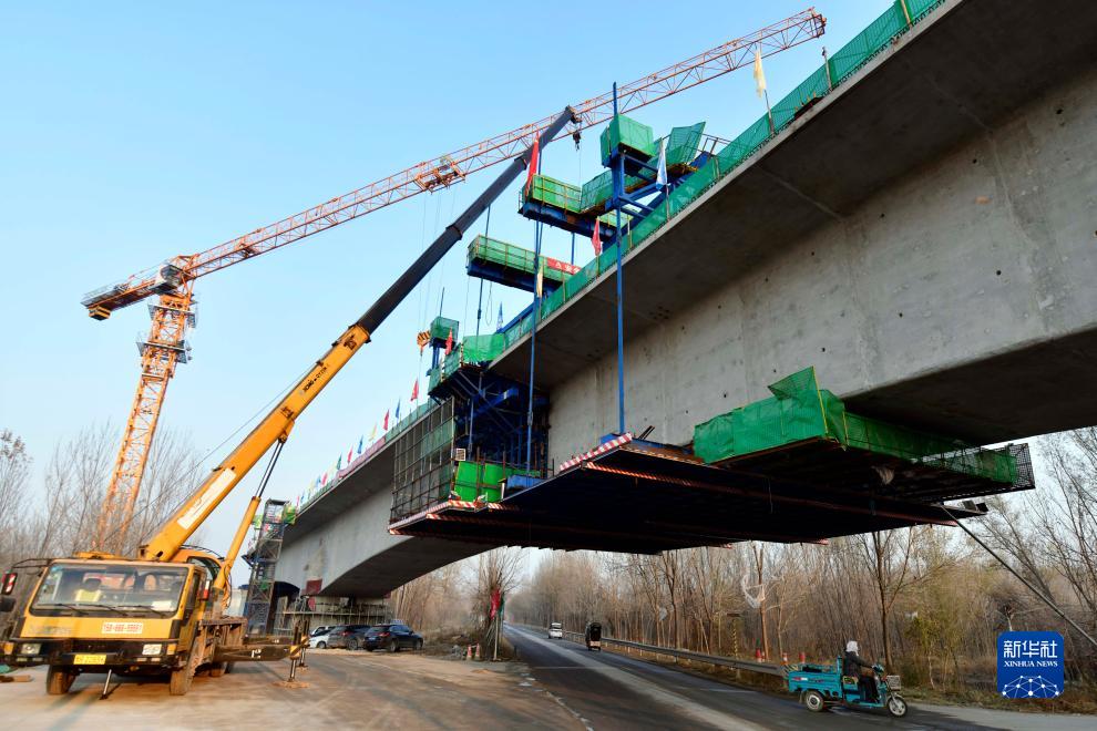 11月21日,在濟濱高鐵商惠濱2號特大橋,山東路橋集團的工作人員在進行橋梁施工作業。