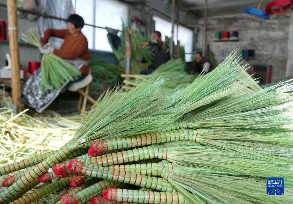 11月21日,河北省樂亭縣毛莊鎮一家笤帚專業合作社的社員在制作笤帚。