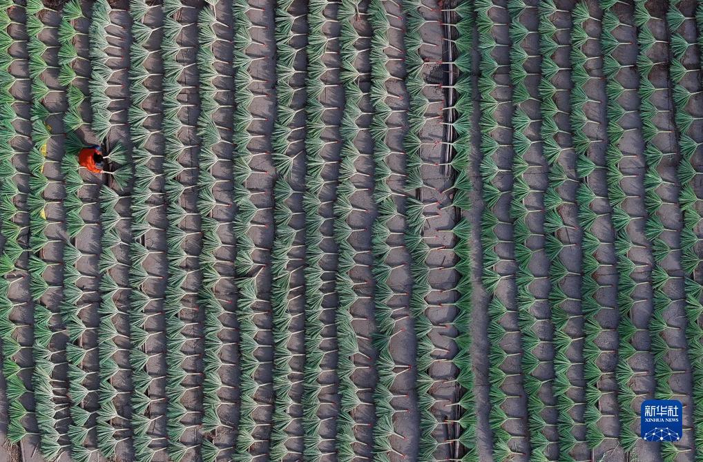 11月21日,河北省樂亭縣毛莊鎮一家笤帚專業合作社的社員在晾曬笤帚(無人機照片)。