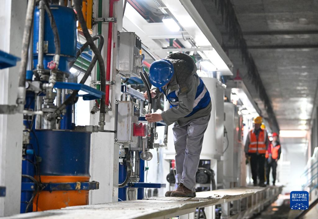 11月21日,來自中建八局的工程施工人員在作業(yè)場所對盾構(gòu)機運行進行維護監(jiān)測。
