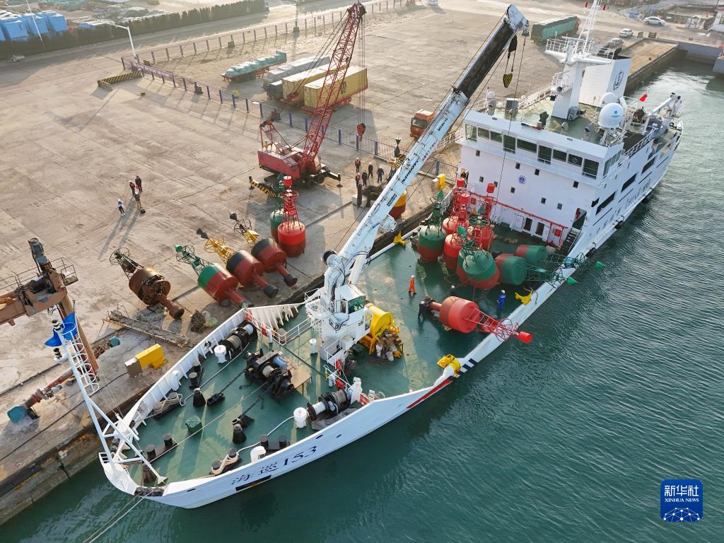 11月21日,在山東龍口港,吊車將航標裝上“海巡153”航標船(無人機照片)。
