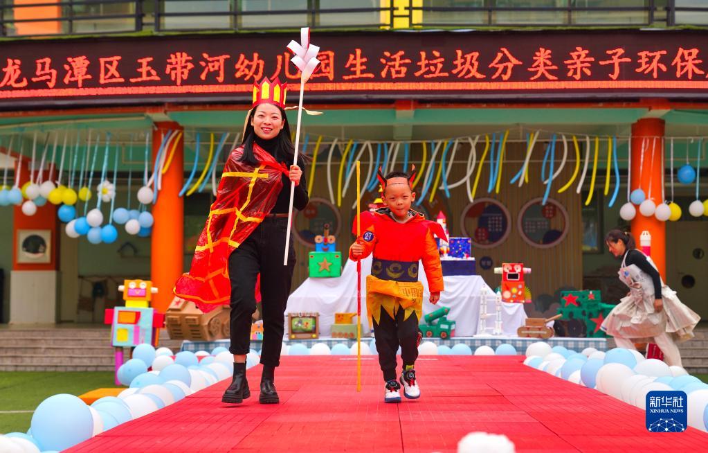 當(dāng)日,四川省瀘州市龍馬潭區(qū)玉帶河幼兒園舉辦了一場垃圾分類親子時(shí)裝秀,小朋友和家長身著用廢紙殼、塑料袋、舊報(bào)紙等材料制作的各類創(chuàng)意服裝走上舞臺(tái)進(jìn)行展示,讓低碳生活、變廢為寶的理念深入幼兒心靈。