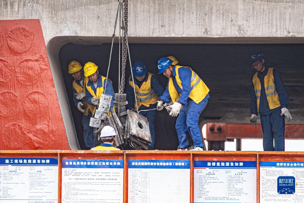 11月21日,在渝昆高鐵川渝段樓灣特大橋建設施工現場,施工人員進行箱梁架設作業。