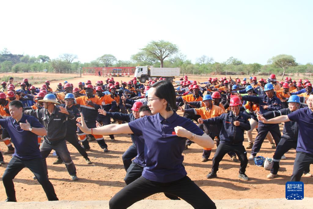11月21日,在津巴布韋南部邊境地區(qū)的新太資源棕櫚河冶金產(chǎn)業(yè)園,中國醫(yī)療隊隊員帶領中企員工做八段錦。