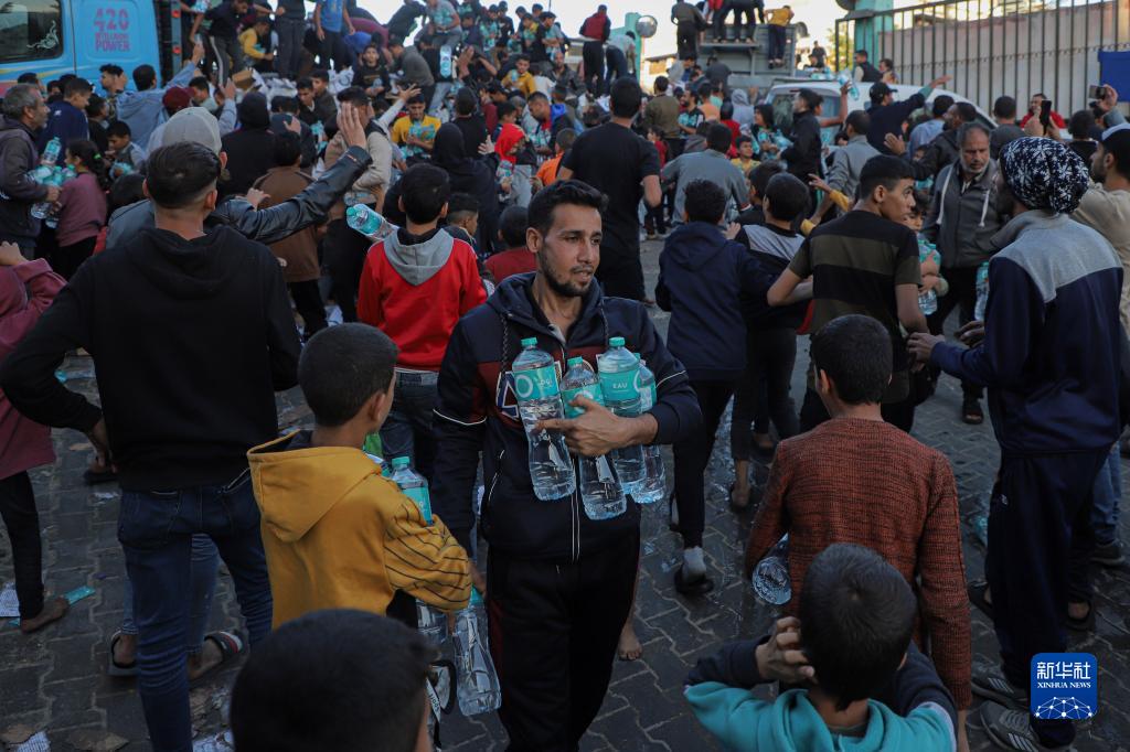 11月21日,在加沙地帶南部城市汗尤尼斯,民眾領取飲用水。