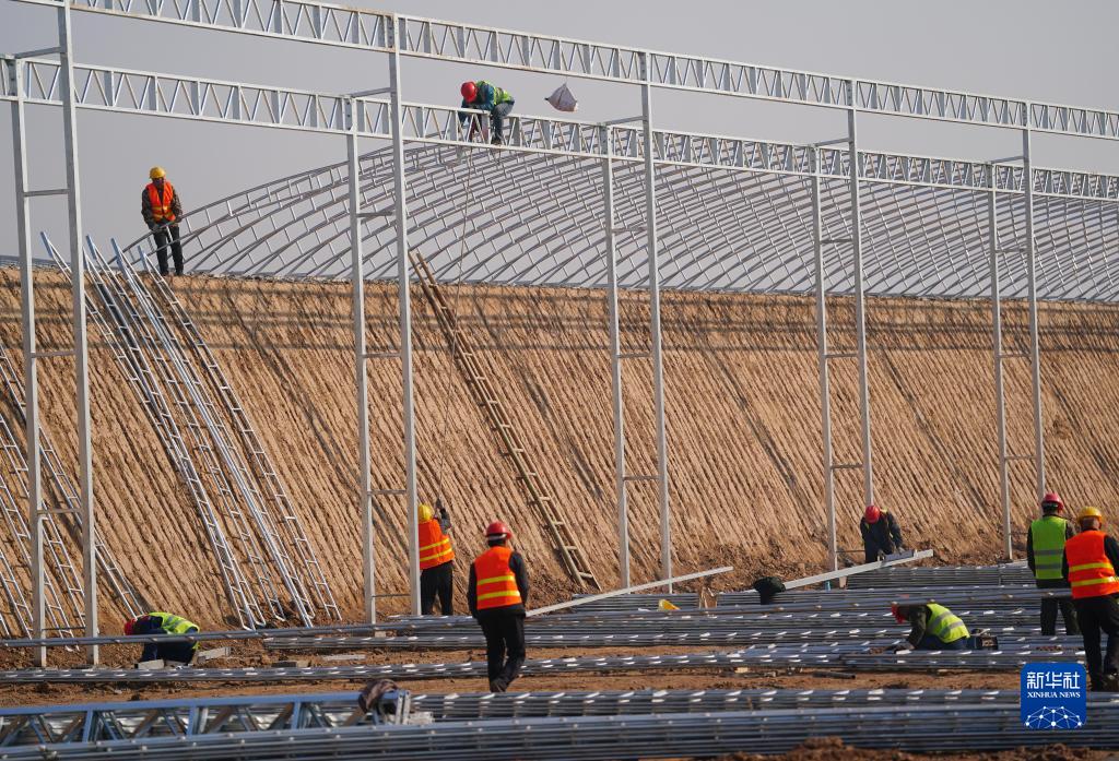 工人在進(jìn)行饒陽縣農(nóng)村產(chǎn)業(yè)融合發(fā)展示范園項目施工(11月20日攝)。