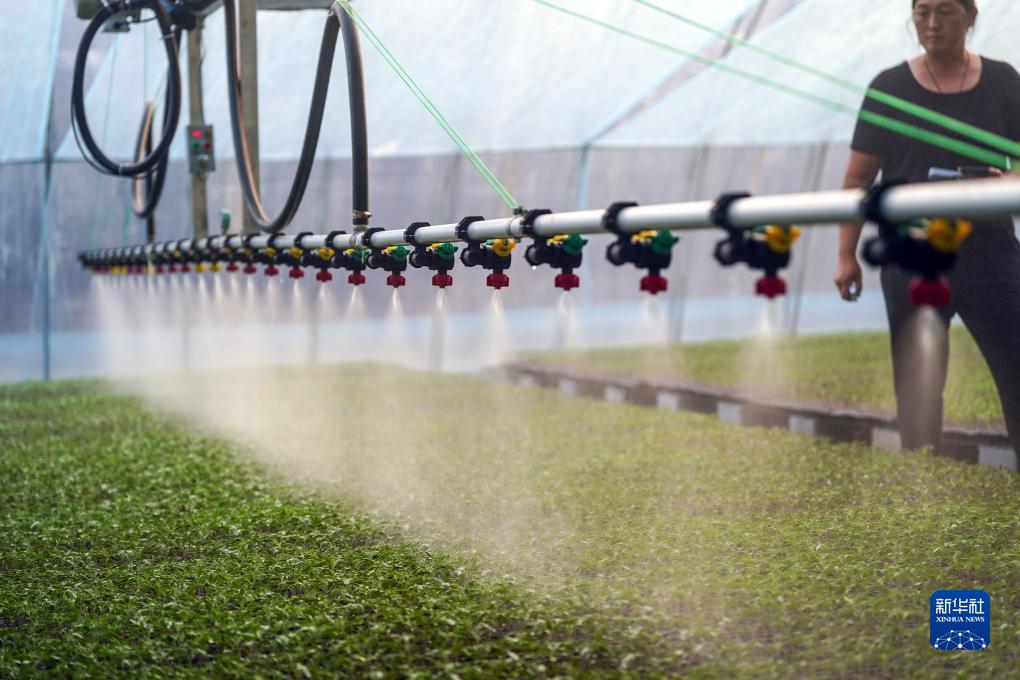 在饒陽縣大尹村鎮(zhèn)南北巖村一個新建的全鋼架無立柱新型日光溫室里,自動噴淋裝置正在給西紅柿幼苗澆水(11月20日攝)。