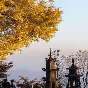 杭塢山位于浙江省諸暨市北部店口、次塢、姚江三鎮(zhèn)交界處,海拔500多米。初冬時(shí)節(jié),杭塢山頂三德寺門外有著500年和300年樹齡的兩株古銀杏金黃滿樹,成為當(dāng)?shù)厣洁l(xiāng)美麗的風(fēng)景。