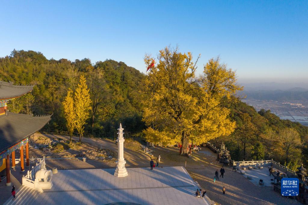杭?jí)]山位于浙江省諸暨市北部店口、次塢、姚江三鎮(zhèn)交界處,海拔500多米。初冬時(shí)節(jié),杭?jí)]山頂三德寺門外有著500年和300年樹齡的兩株古銀杏金黃滿樹,成為當(dāng)?shù)厣洁l(xiāng)美麗的風(fēng)景。