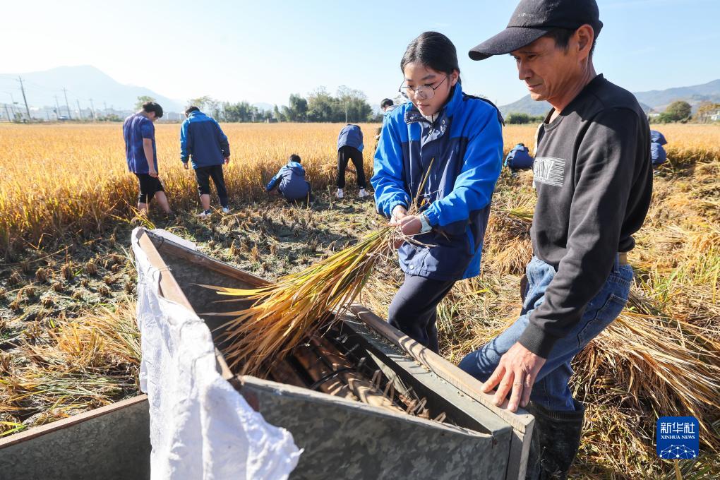 11月22日,在趙家鎮花明泉村,學生在農民的指導下學習打稻。