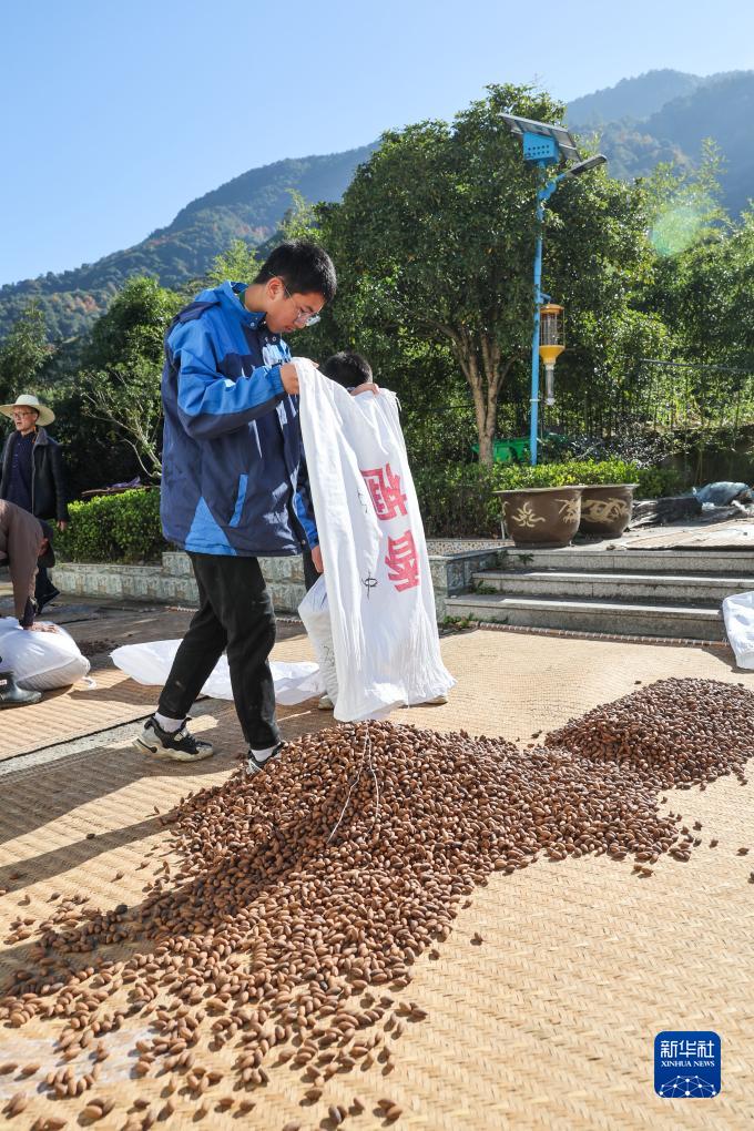 11月22日,學生在趙家鎮花明泉村明樂果業實踐基地幫助果農曬香榧。