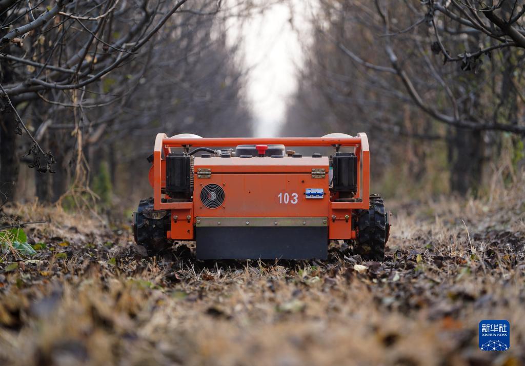一臺無人割草機器人在威縣賀營鎮紅龍集村的梨園里除草(11月21日攝)。