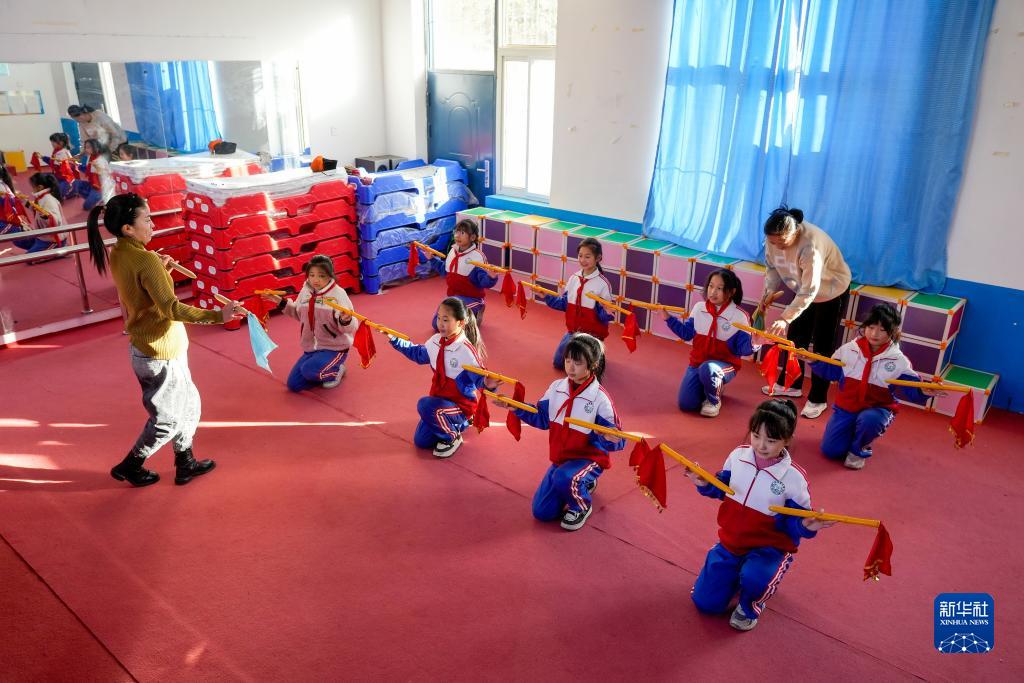 11月22日,地秧歌藝人在河北省灤州市小閆營小學(xué)指導(dǎo)學(xué)生練習(xí)地秧歌。