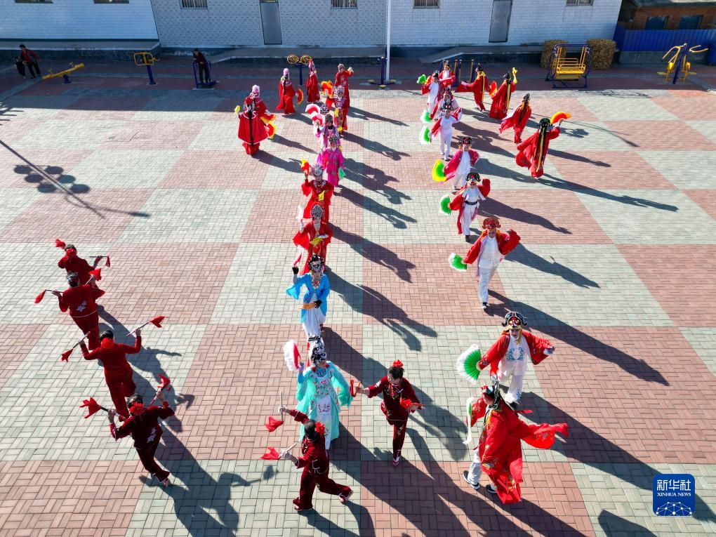 河北省灤州市葛莊村地秧歌隊隊員在村廣場上表演(11月17日攝,無人機照片)。