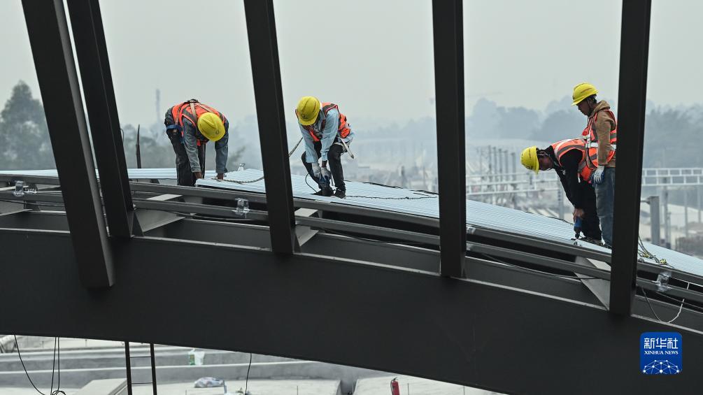中鐵十一局的工人在鋪設(shè)玉林北站站房的金屬屋面(11月22日攝)。