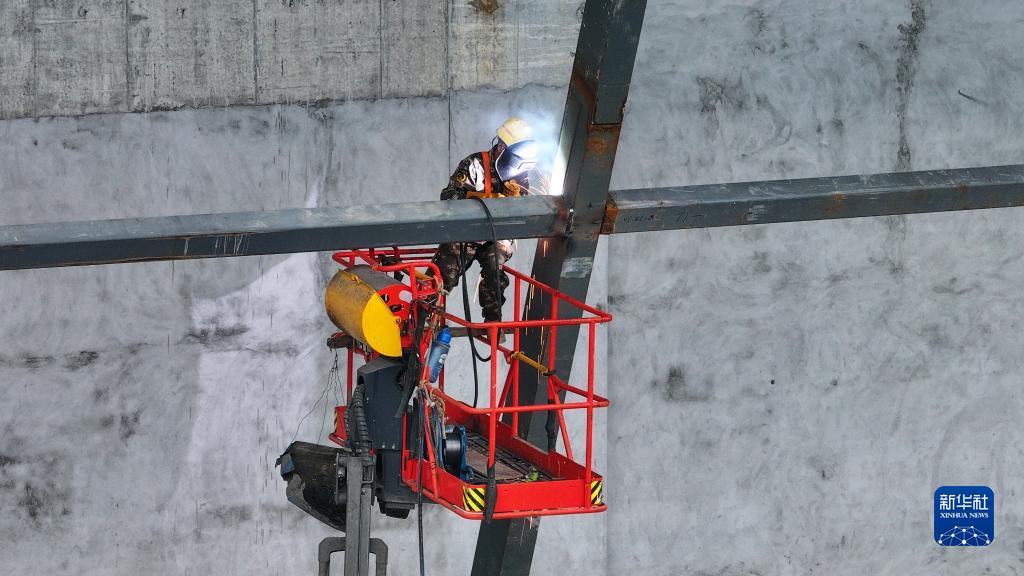 中鐵十一局的工人在焊接玉林北站站房的鋼梁(11月22日攝,無人機照片)。