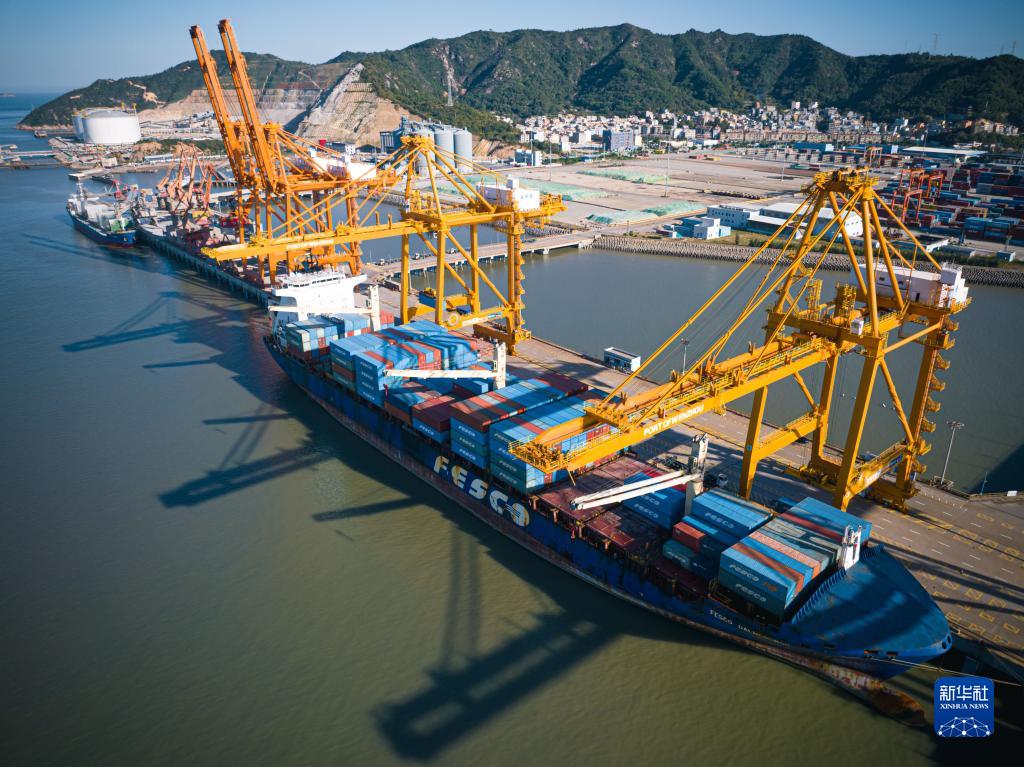 11月22日,貨輪停靠在溫州港狀元岙集裝箱碼頭卸載集裝箱(無人機照片)。