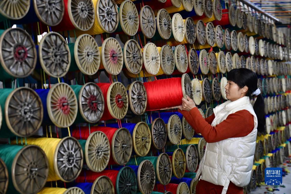 11月22日,在惠民縣李莊鎮(zhèn)一家繩網(wǎng)企業(yè),工作人員在更換線軸。